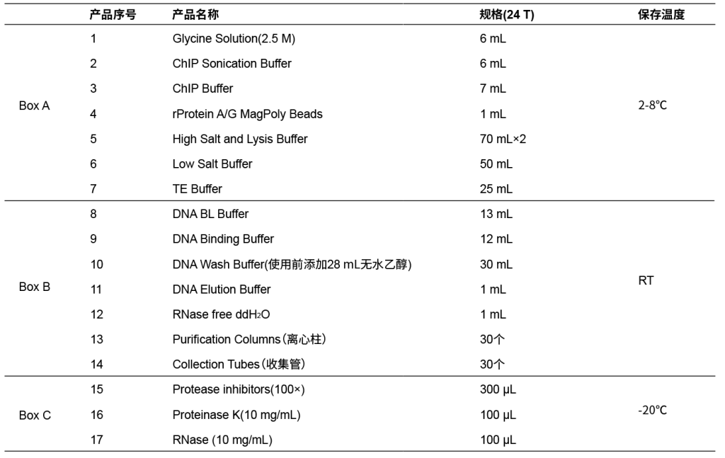 该试剂盒包含Box A、Box B和Box C,可进行24次独立的染色质免疫沉淀(ChIP)反应,提供的缓冲液可供六个15 cm平板的培养细胞制备染色质,每个平板可提供多达10个染色质制剂(随细胞和测定类型的不同而不同),检测时间大约2-3天。经验证,试剂盒中提供的rProtein A/G MagPoly Beads,能更好的免疫沉淀染色质。在蛋白质-DNA解交联后,DNA 使用离心柱法进行纯化,方便快捷,无需进行苯酚/氯仿提取和乙醇沉淀。目的DNA序列的富集可通过标准PCR、定量实时 PCR或测序等各种方法进行分析。
