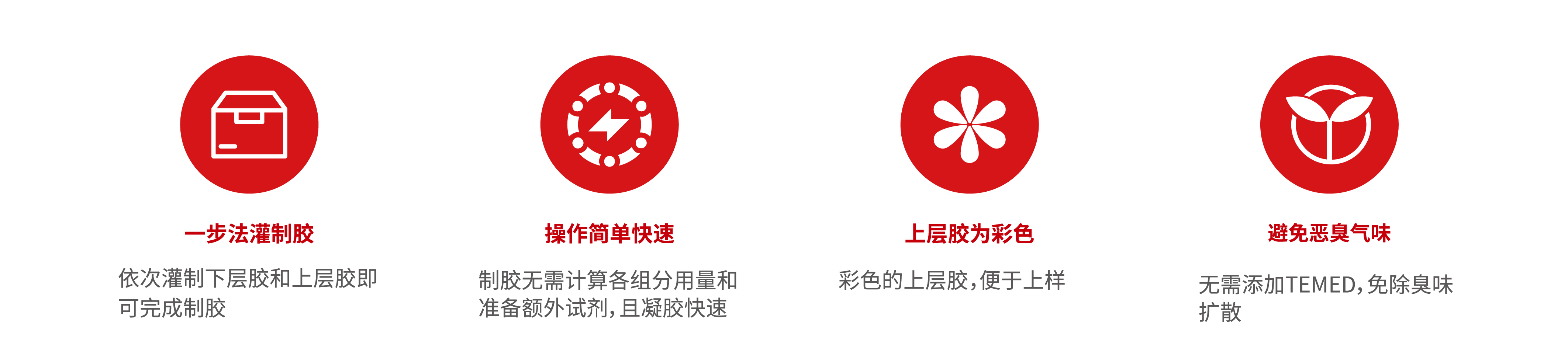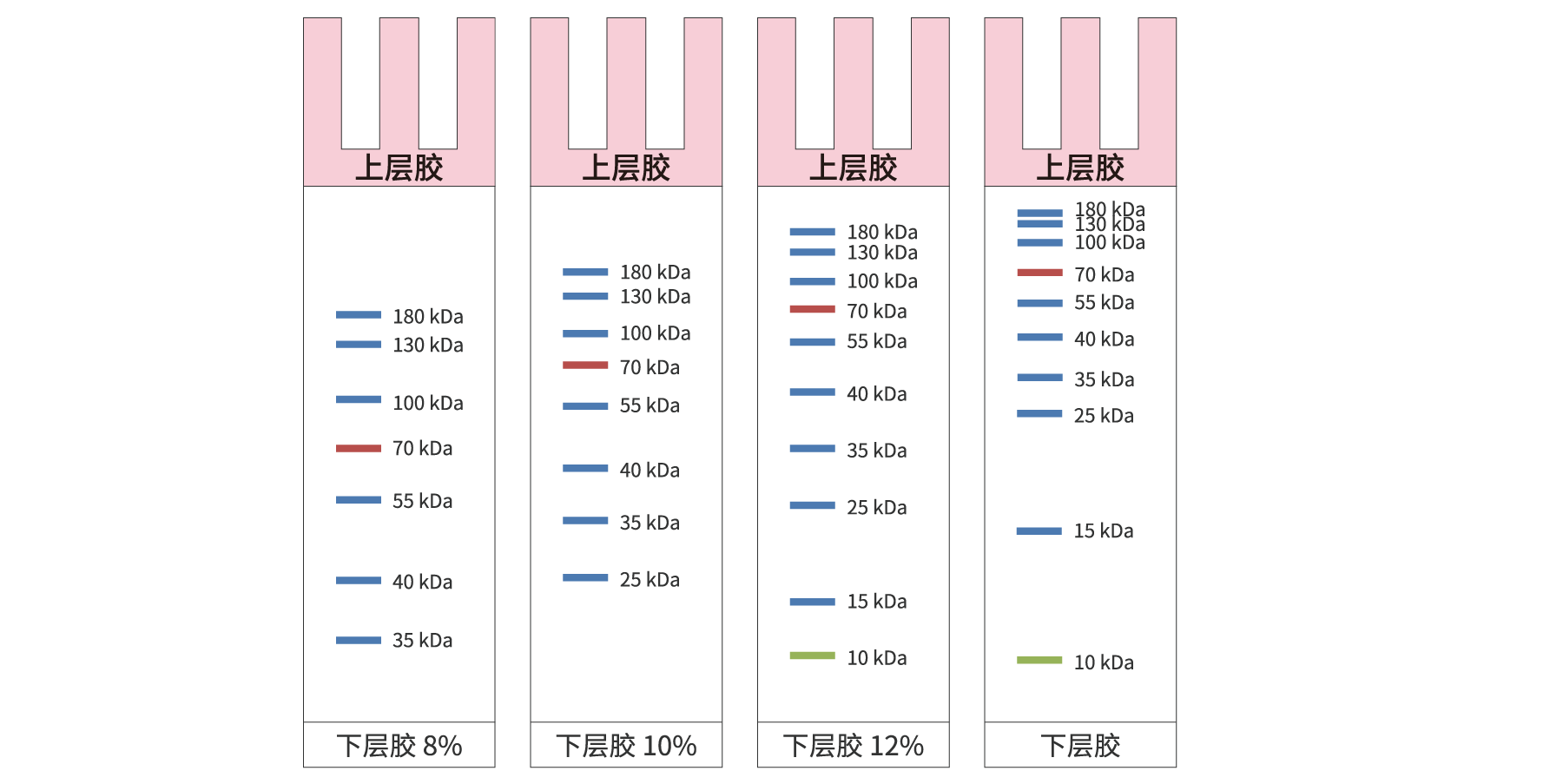本产品适用于Tris – Glycine电泳体系,包含制备浓缩胶(上层胶)和分离胶(下层胶)的预混溶液,配胶过程无需计算各组分的用量,无需稀释;无需添加TEMED;只需将上层胶溶液与上层胶缓冲液、下层胶溶液与下层胶缓冲液分别1:1混合,加入促凝剂即可凝胶,简化制备SDS-PAGE凝胶的操作步骤,可快速灌制多块凝胶,使制胶过程更加便捷。上层胶带有颜色使上样孔清晰可见,便于上样。本产品配套提供的促凝剂干粉状态保存于2-8℃,溶解后应保存于-20℃。