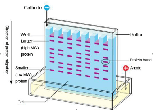 以淀粉胶、琼脂或琼脂糖凝胶、聚丙烯酰胺凝胶等作为支持介质的区带电泳法称为凝胶电泳。聚丙烯酰胺凝胶电泳是以聚丙烯酰胺凝胶作为支持物的一种电泳方法,人为控制聚丙烯酰胺凝胶聚合成孔径的大小,通过类似分子筛的作用把蛋白质分开。它有两种形式:非变性聚丙烯酰胺凝胶电泳(Native-PAGE)和SDS-聚丙烯酰胺凝胶(SDS-PAGE)。