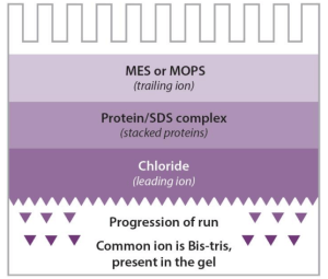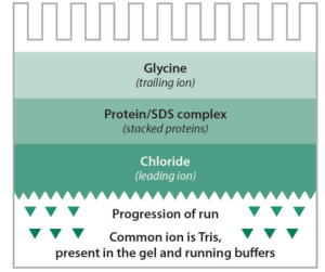 SDS-聚丙烯酰胺凝胶(SDS-PAGE)仅根据蛋白质亚基分子量的不同就可以分开蛋白质。SDS是阴离子去污剂,作为变性剂和助溶试剂,它能断裂分子内和分子间的氢键,使分子去折叠,破坏蛋白分子的二、三级结构。而强还原剂如巯基乙醇,二硫苏糖醇能使半胱氨酸残基间的二硫键断裂。在样品和凝胶中加入还原剂和SDS后,分子被解聚成多肽链,解聚后的氨基酸侧链和SDS结合成蛋白- SDS胶束,所带的负电荷大大超过了蛋白原有的电荷量,这样就消除了不同分子间的电荷差异和结构差异。蛋白质的迁移率仅取决于蛋白质的分子质量的大小。与已知分子质量的标准品比较,可以测定蛋白质的分子质量。