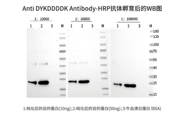 DYKDDDDK肽段是融合蛋白表达纯化过程中最常用的标签(tag)之一,DYKDDDDK 肽段也经常被称为 Flag肽段,是 Sigma公司的注册商标。它可以连接在融合蛋白的 N 端、C端或序列中间,具有极好的亲水性,更容易展示在融合蛋白的表面,干扰融合蛋白功能的可能性较小。这一标签还具有一个优势:连接在目的蛋白N端时,可以被 Enterokinase(EKprotease)从序列C端赖氨酸的位置切除,而不留下冗余残基。抗 DYKDDDDK 标签的抗体能对 DYKDDDDK 标签融合蛋白进行准确的检测和纯化,通过一定的工艺将辣根过氧化物酶 (HRP)偶联至DYKDDDDK标签抗体上,进行 WB 实验时加入发光液 A和 B,一般是鲁米诺和过氧化氢,在辣根过氧化物酶(HRP)的催化作用下,鲁米诺与过氧化氢反应生成一种过氧化物,过氧化物不稳定随即分解,形成一种能发光的电子激发中间体,当后者由激发态返回至基态,就会产生荧光,实现对 DYKDDDDDK 标签融合蛋白快速检测。