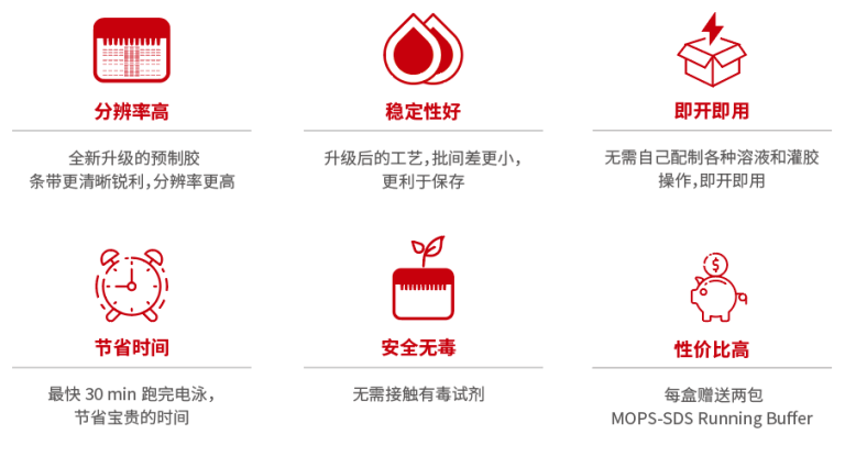 2、 采用全自动凝胶灌注技术,产品的重复性好,质量稳定。独特的凝胶缓冲配方使蛋白电泳条带更为清晰锐利,更加均匀,分辨率更高;