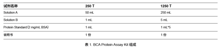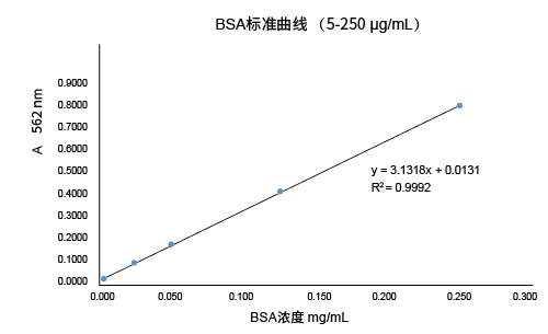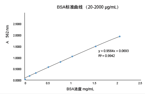 BCA Protein Assay Kit是目前世界上最常用的两种蛋白浓度检测方法之一。BCA蛋白质定量包括两步反应:首先,二价铜离子(Cu2+)在碱性条件下被蛋白质的肽键还原成一价铜离子(Cu+);其次,两个分子的BCA络合一个一价铜离子(Cu+),形成一种在562 nm处有强吸收值的紫色复合物,而复合物的吸收值与蛋白的浓度在一定范围内呈线性相关(如图)。