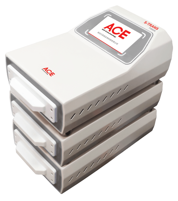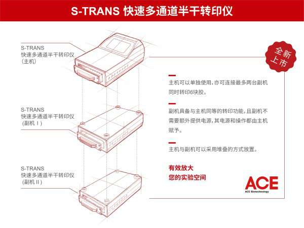 电转印是许多研究和诊断实验室常用的技术。传统湿式转印配制试剂以及转印过程需要消耗大量时间,通常需要一个半小时以上。ACE 公司的 S-TRANS 快速多通道半干转印仪在保证性能的情况下,大大缩短了蛋白转印时间。使用 S-TRANS 快速多通道半干转印仪,转印时间最快缩短到 5 min,配套的转印缓冲液提供了较高的转印效率和重现性。S-TRANS 转印系统由主机、半干式转印盒、两极缓冲液和吸水介质组成;