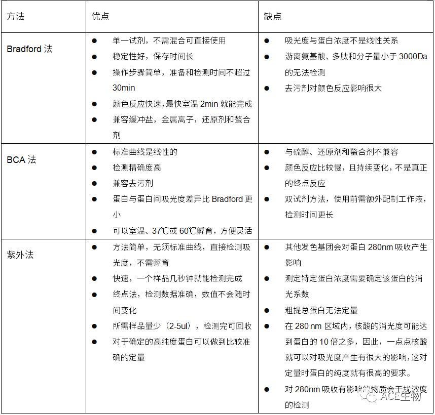 每种蛋白定量方法都有其局限性,而这取决于应用和分析的特定蛋白本身。在选择蛋白定量方法时,需要考虑的特性是:灵敏度(较低的检测限)、与样品中常见物质的相容性(例如,去污剂剂、还原剂、抑制剂、盐和缓冲等)、标准曲线的线性度和蛋白质间的差异。