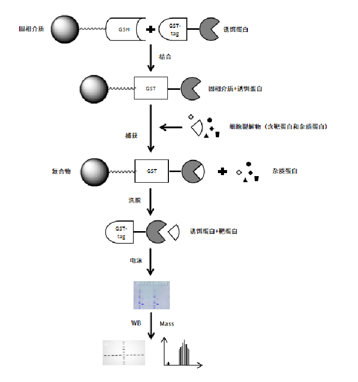 不同于免疫沉淀/免疫共沉淀这种基于抗体-抗原相互作用的方法,Pull Down是在已知的诱饵蛋白上,重组表达设计一个亲和标签,然后通过这个标签和固定了特异性亲和配体的固相介质进行结合,然后去捕获与之相互作用的蛋白,形成一个由这三个部分组成的复合物。诱饵蛋白和靶蛋白的复合物可以通过相应的方法,从固相介质上洗脱,通过SDS-PAGE进行电泳分析,并结合Western blot或质谱等进一步鉴定,确定相互作用的蛋白质性质等。