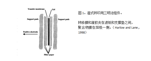 对于湿式转移的基本要求是将三明治结构放置在带有铂丝电极的缓冲器皿内进行(图1)。有许多不同的仪器可以将蛋白质(或其他大分子)从凝胶横向转移到膜上。这其中大部分的仪器都是基于托宾的设计 (Towbin al.1979):也就是将垂直的不锈钢/铂电极置于在一个大槽内。