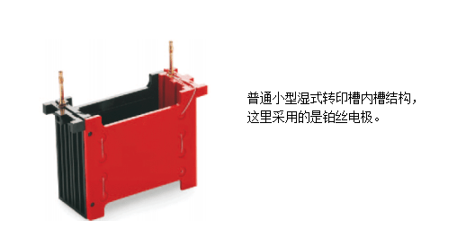目前实验室常用的湿式转印槽,其外槽通常为有0.5-10L容量的塑料器皿,并有专门的结构可以放置并固定内槽或组件,配有冷却装置。其电极为曲折缠绕的金属线或板式电极,电极反向于三明治结构的一面通常都被很仔细的包覆起来,跟外部缓冲液隔开,以避免不必要的电流损失,电极通常通过内槽上的结构与外部电源相连接。整体式的内槽下端为开放式,通常支持放入多个转印用三明治组件。金属线的直径及板式电极的厚度通常在0.2-2mm之间,两极的间距通常大于4cm。阳极的材质选择为铂,钛,铑或其合金,阴极的选择除了以上几种还可以选择一些耐腐蚀的金属材料,如不锈钢。对于无整体内槽结构的湿转槽,通常会将各组件分别插入外槽,包括三明治结构,电极,冷却结构。